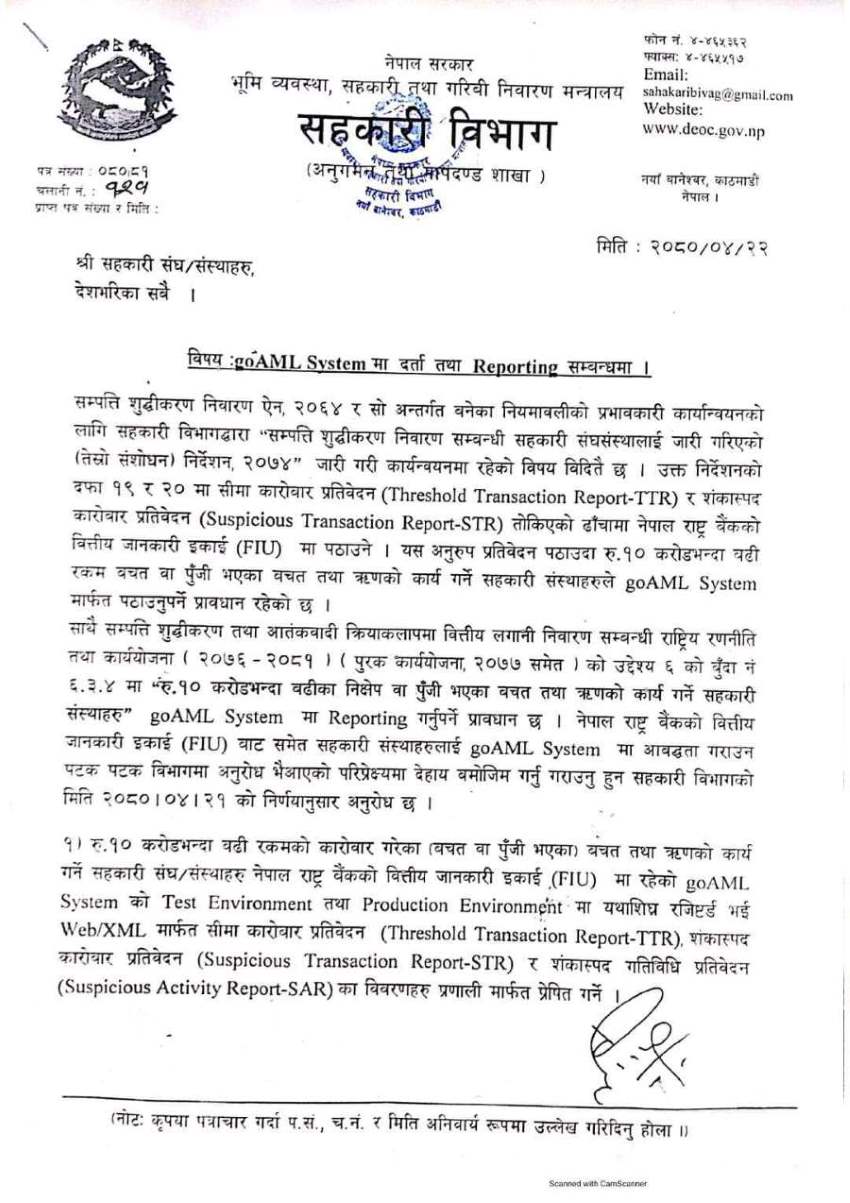 विभागले १० करोडभन्दा बढीको कारोबार गर्ने सहकारीहरुलाई केन्द्रिय बैंकको वित्तीय जानकारी ईकाईमा रहेको go AML को Test Environment तथा Production Environment मा यथाशीघ्र रजिष्टर्ड भई वेब वा एक्सएमएलमार्फत सीमा कारोबार प्रतिवेदन Threshold Transaction Report-TTR, शंकास्पद कारोबार प्रतिवेदन Suspicious Transaction Report – STR, र शंकास्पद गतिविधि प्रतिवेदन Suspicious Activity Report-SAR जस्ता विवरणहरु प्रणालीमा प्रेषित गर्न आव्हान गरेको छ ।