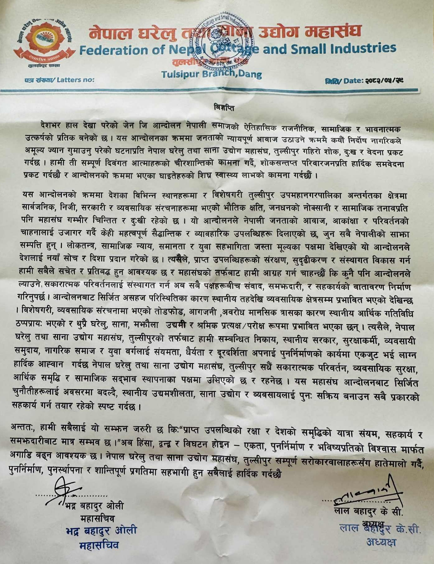 त्यस्तै, नजिकैका किराना पसल र नास्ता पसलसमेत आगलागीबाट क्षतिग्रस्त भएका छन्। आन्दोलनकारीहरूले मालपोत कार्यालयसँगै उच्च अदालत तुलसीपुर र लोक सेवा आयोगको कार्यालयमा समेत आगजनी गरी पूर्ण रूपमा ध्वस्त बनाएका छन्।