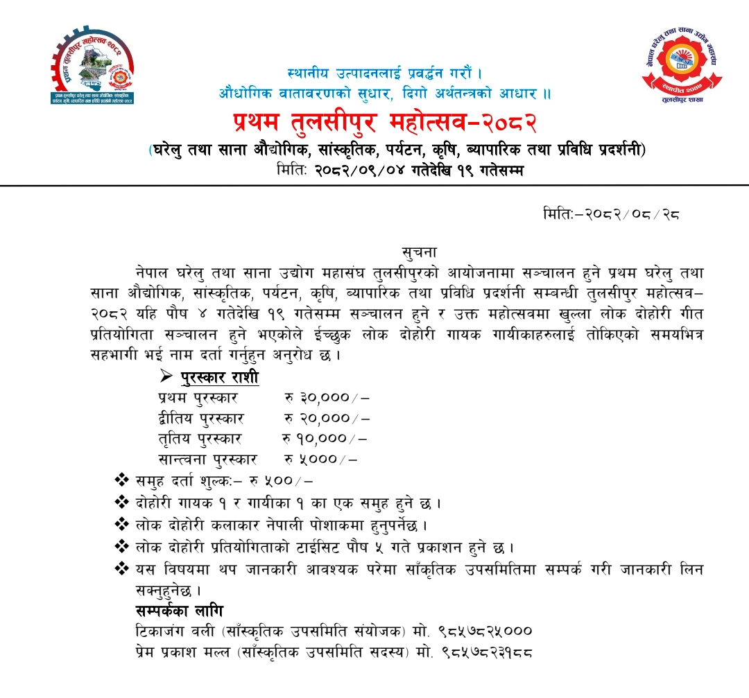 दाङ। स्थानीय उत्पादनलाई प्रवर्द्धन गर्ने उद्देश्यका साथ आयोजना हुन लागेको प्रथम तुलसीपुर महोत्सव–२०८२ मा खुला लोकदोहोरी गीत प्रतियोगिता सञ्चालन हुने भएको छ। नेपाल घरेलु तथा साना उद्योग महासंघ तुलसीपुरको आयोजनामा हुने महोत्सव आगामी पौष ४ गतेदेखि १९ गतेसम्म सञ्चालन हुनेछ।